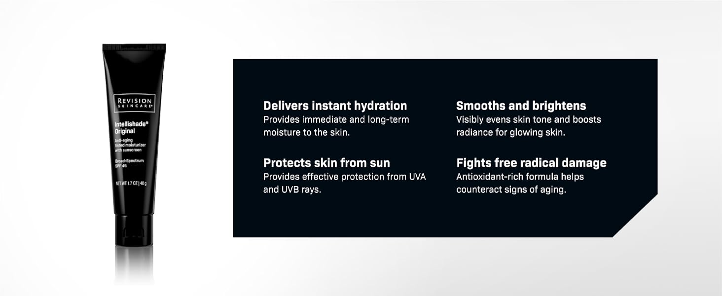 Intellishade®Original- A 5-in-1 daily anti-aging tinted moisturizer with broad-spectrum SPF 45 that is formulated to correct, protect, conceal, brighten and hydrate skin. Prevents visible signs of aging and enhances skin’s natural moisture barrier, improves the appearance of fine lines and wrinkles and brightens and evens skin tone while reducing the appearance of redness. Also protects skin from UVA/UVB radiation. The sheer mineral tint conceals and restores skin’s youthful appearance.